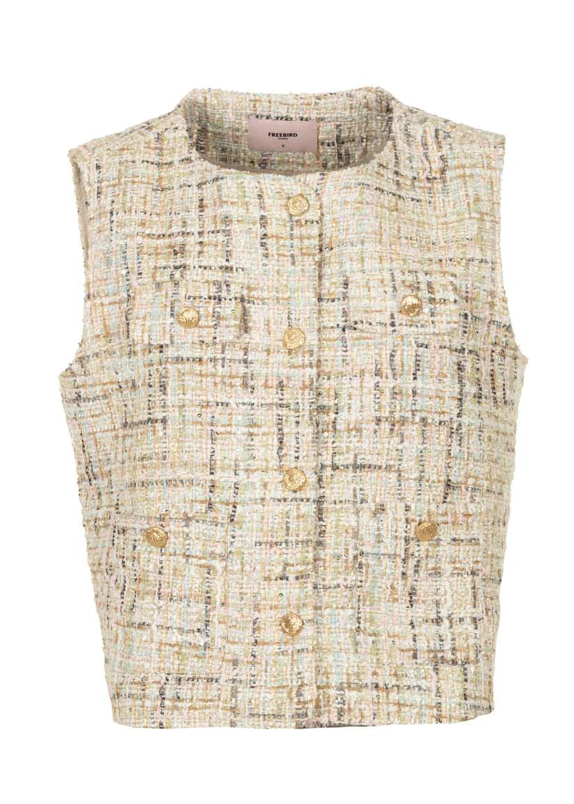 De rijke mix van kleuren en het subtiele glittereffect geven dit item een speelse, maar verfijnde uitstraling. De klassieke knoopsluiting aan de voorkant en het mouwloze silhouet maken dit gilet tot een veelzijdig statement piece – perfect over een blouse, coltrui of jurk.