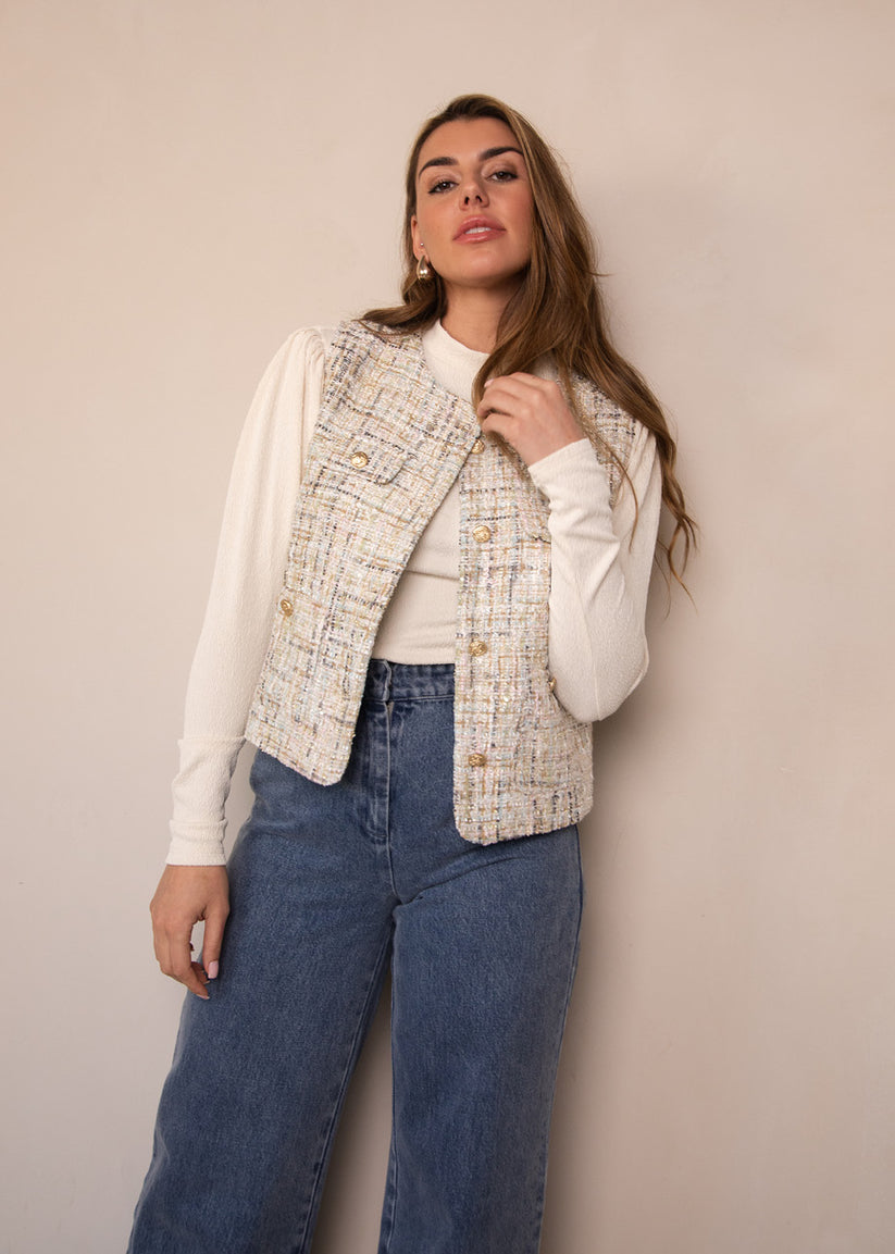 Voeg een vleugje elegantie en textuur toe aan je look met dit chique gilet, vervaardigd uit een zachte bouclé stof met glinsterende accenten.