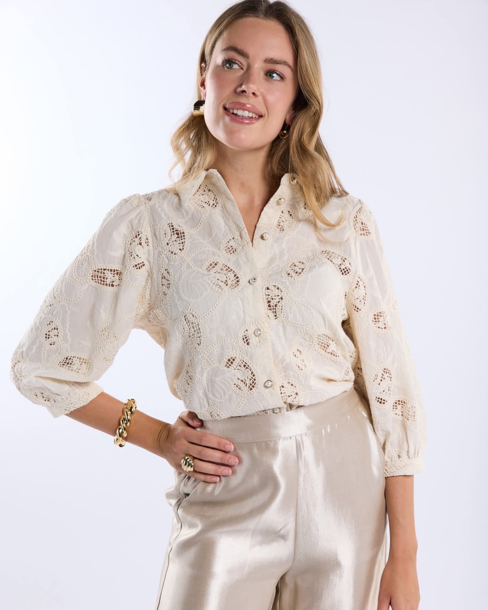 Een verfijnde en vrouwelijke blouse met een subtiele, romantische uitstraling.