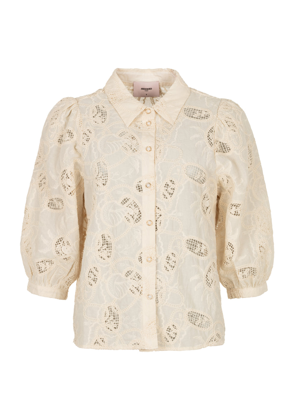 Deze doorknoopblouse is gemaakt van een zachte 3D-geweven katoenkwaliteit die zorgt voor een unieke structuur en een elegante, luchtige look. De kleine pofmouwen voegen een speels, vrouwelijk accent toe, terwijl de off-white tint het ontwerp tijdloos en veelzijdig maakt. Een perfecte blouse om moeiteloos zowel casual als chic te stylen van denim tot zomerse rokken.