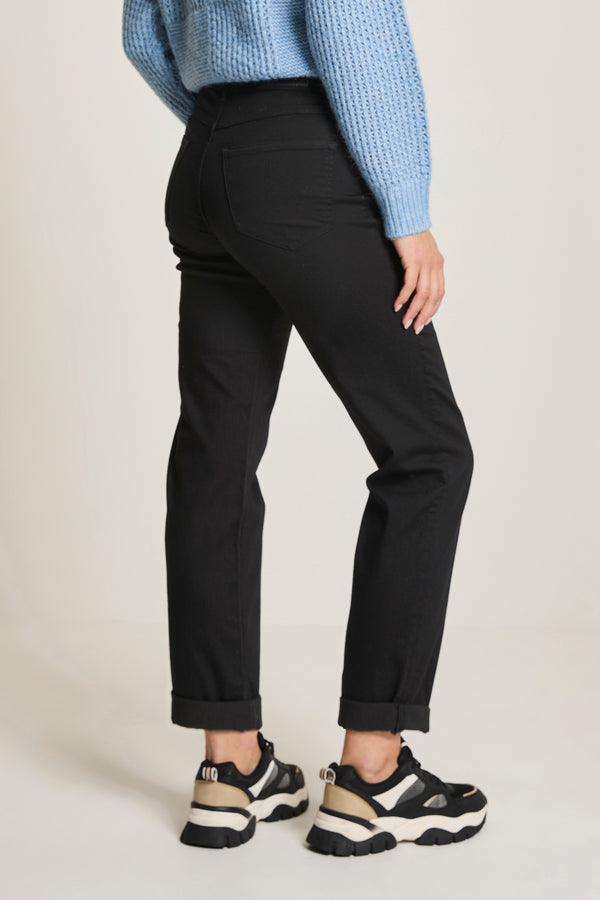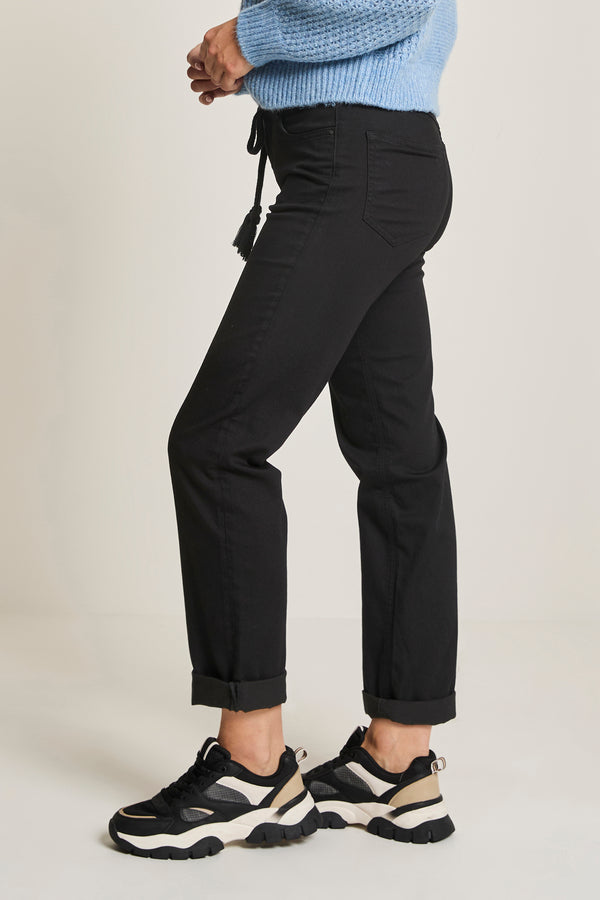 Bobby is een stoere broek met een hoge taille met een losser vallende pasvorm over het hele been. Dankzij de omgeslagen broekspijp staan je sneakers of boots extra leuk onder dit model. Het gevlochten koord is een echte eyecatcher en geeft het een speelse look in combinatie met de broek. De broek heeft speciale naden aan de binnenkant van de broek die ervoor zorgen dat je bij je buik extra ondersteuning krijgt van de broek. Hierdoor is de pasvorm perfect en flatteert hij enorm.