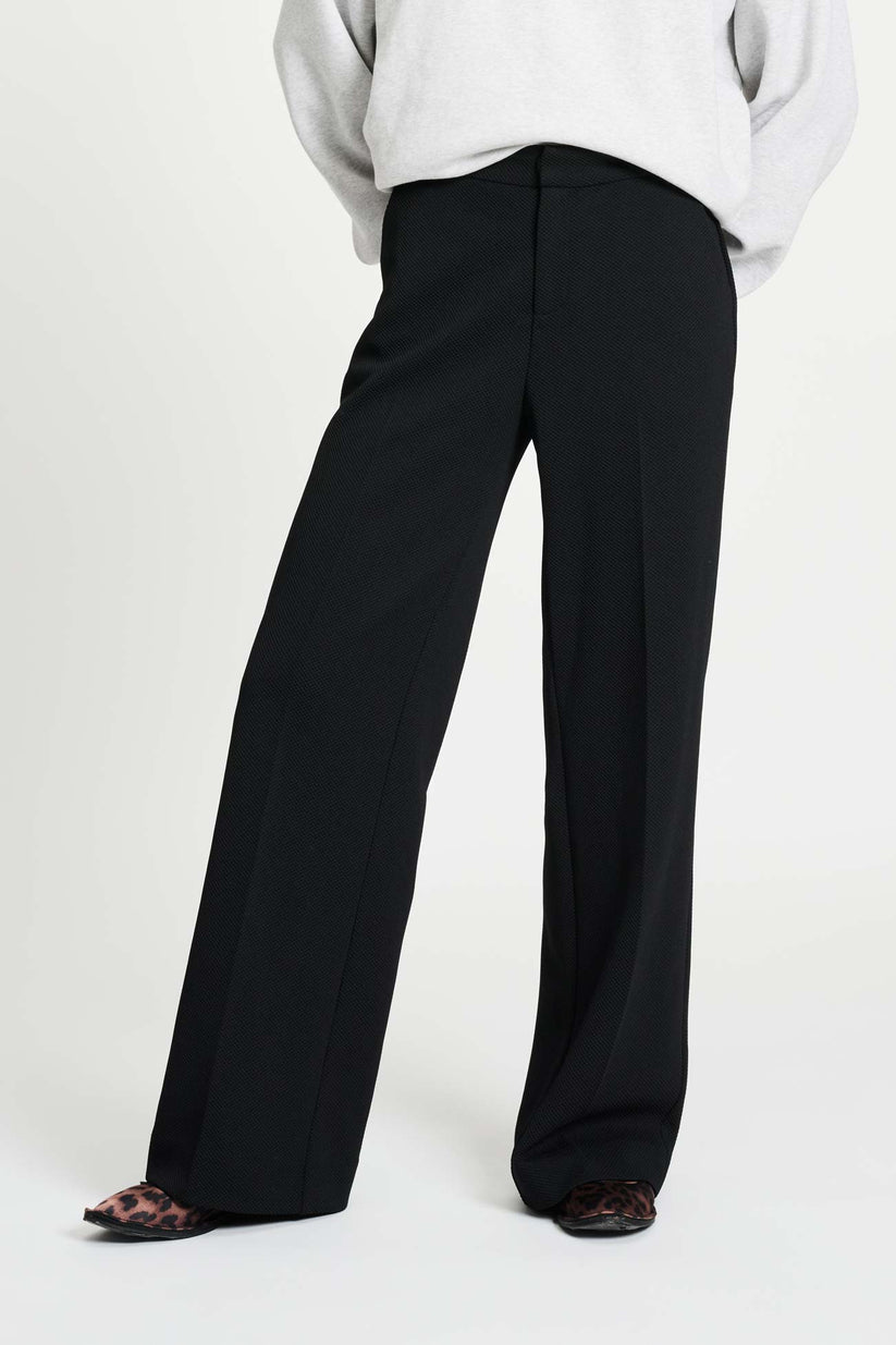 Deze zwarte broek, gemaakt van hoogwaardige piqué stof, combineert comfort met stijl dankzij het elegante wide leg model. Deze broek biedt niet alleen een trendy uitstraling, maar is ook gemaakt van duurzamer materiaal, waardoor de broek ‘more sustainable’ is.