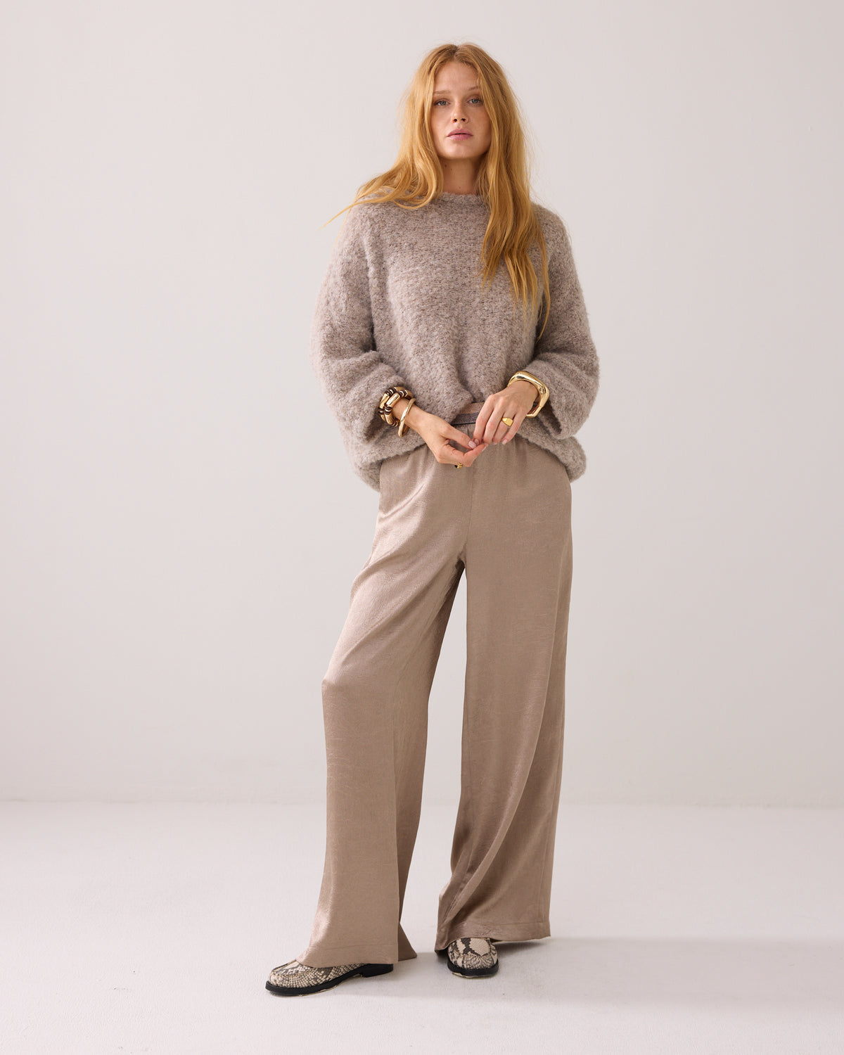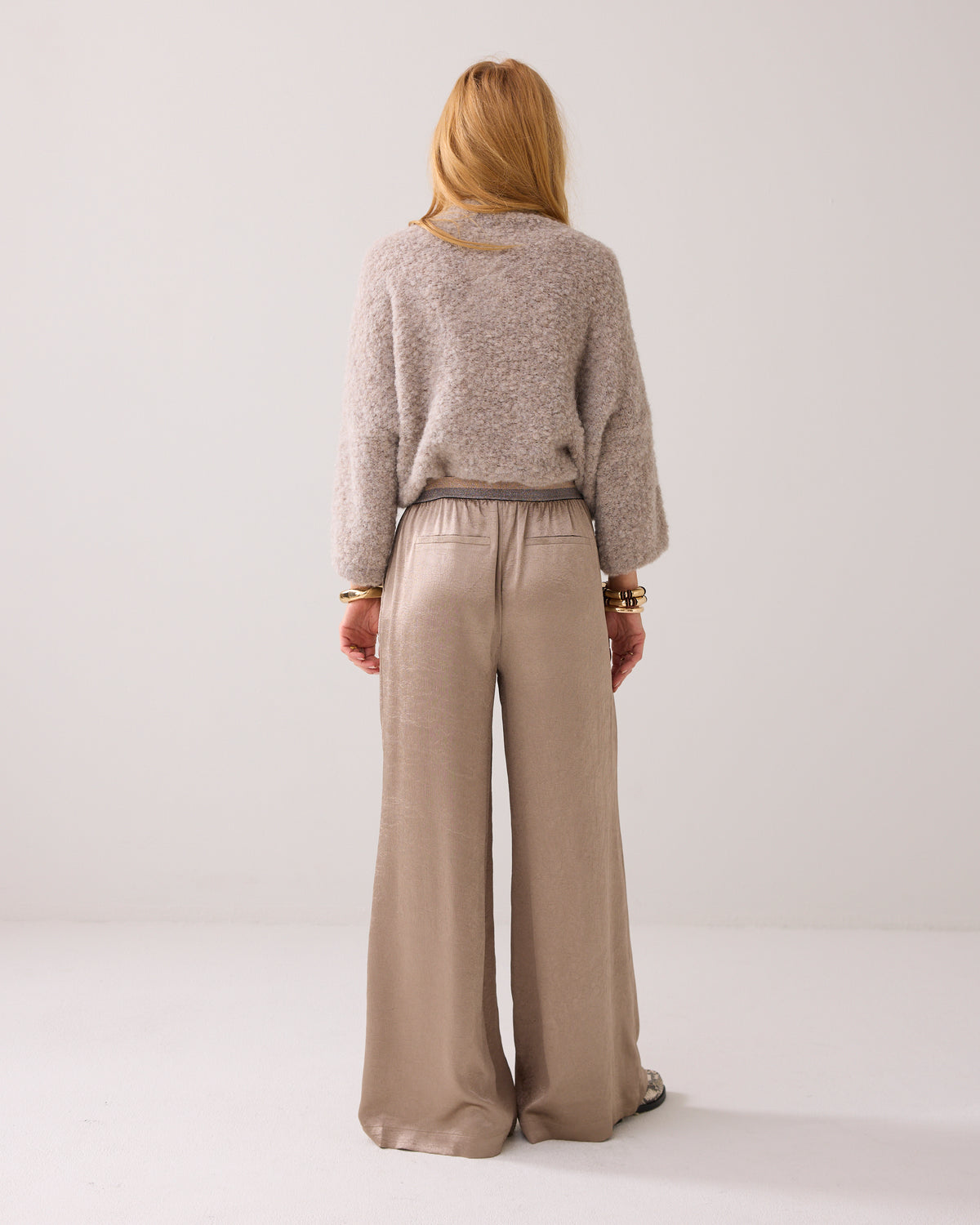 • Hoge taille • Ultrawijde pijpen • Lurex elastiek in twee tonen • Steekzakken en paspelzakken achter