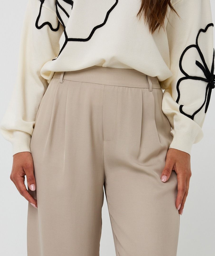 Wijde nette broek met plooien en een comfortabele elastische tailleband. Deze broek is gemaakt van 60% viscose, 20% tencel, 15% rayon en 5% linnen. Model is 1.73m en draagt maat S.