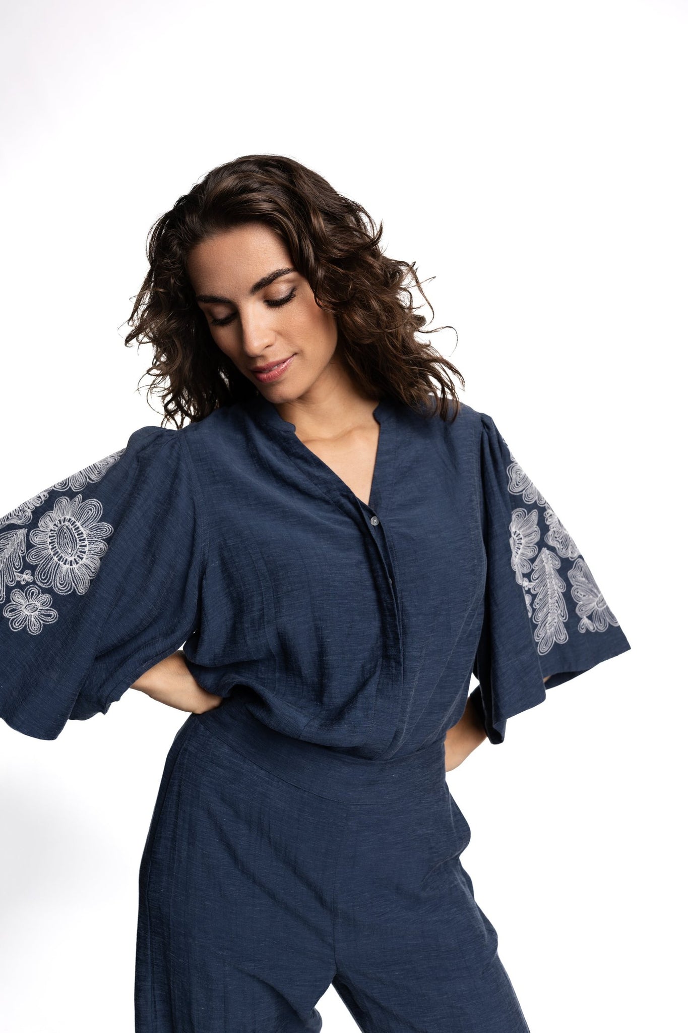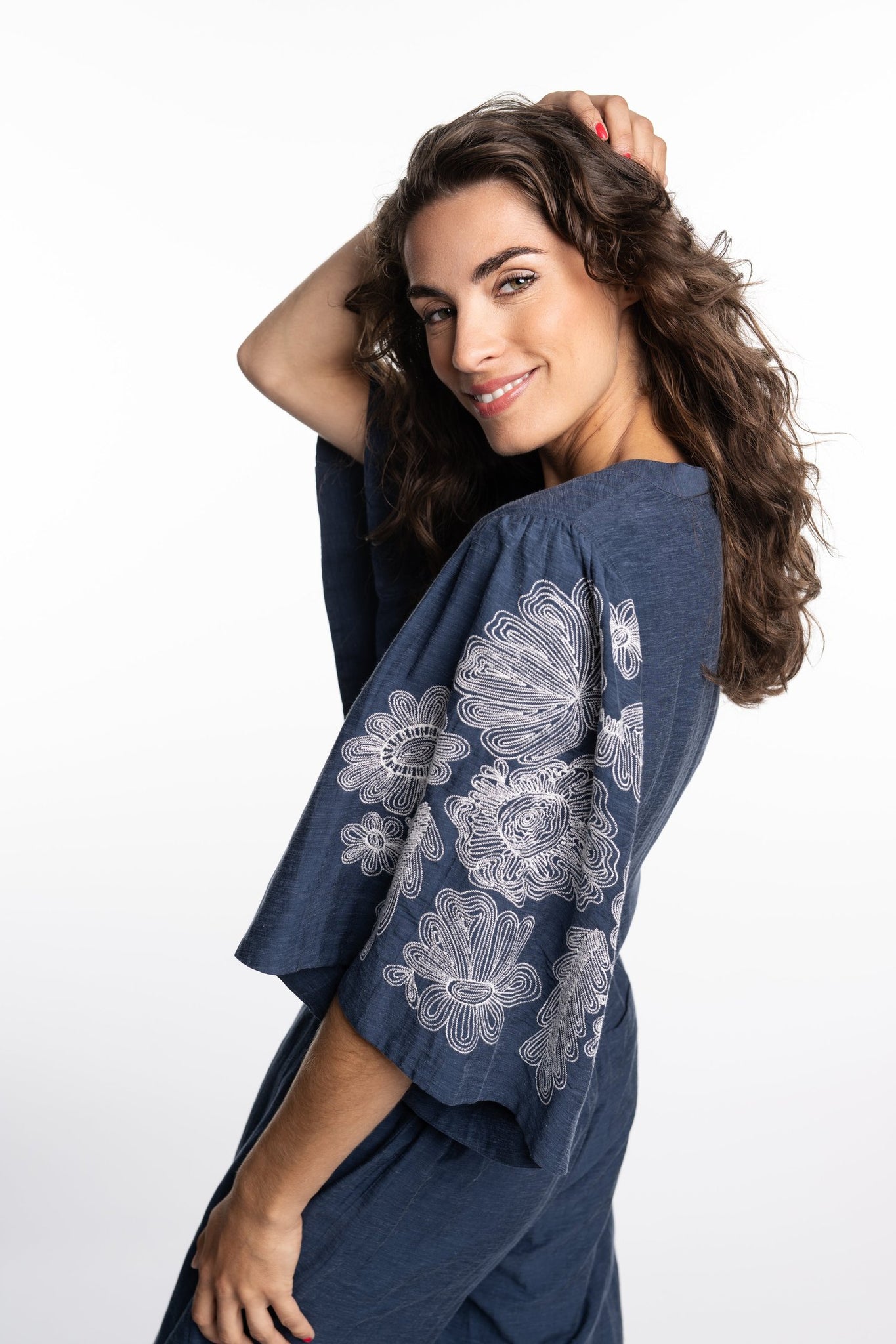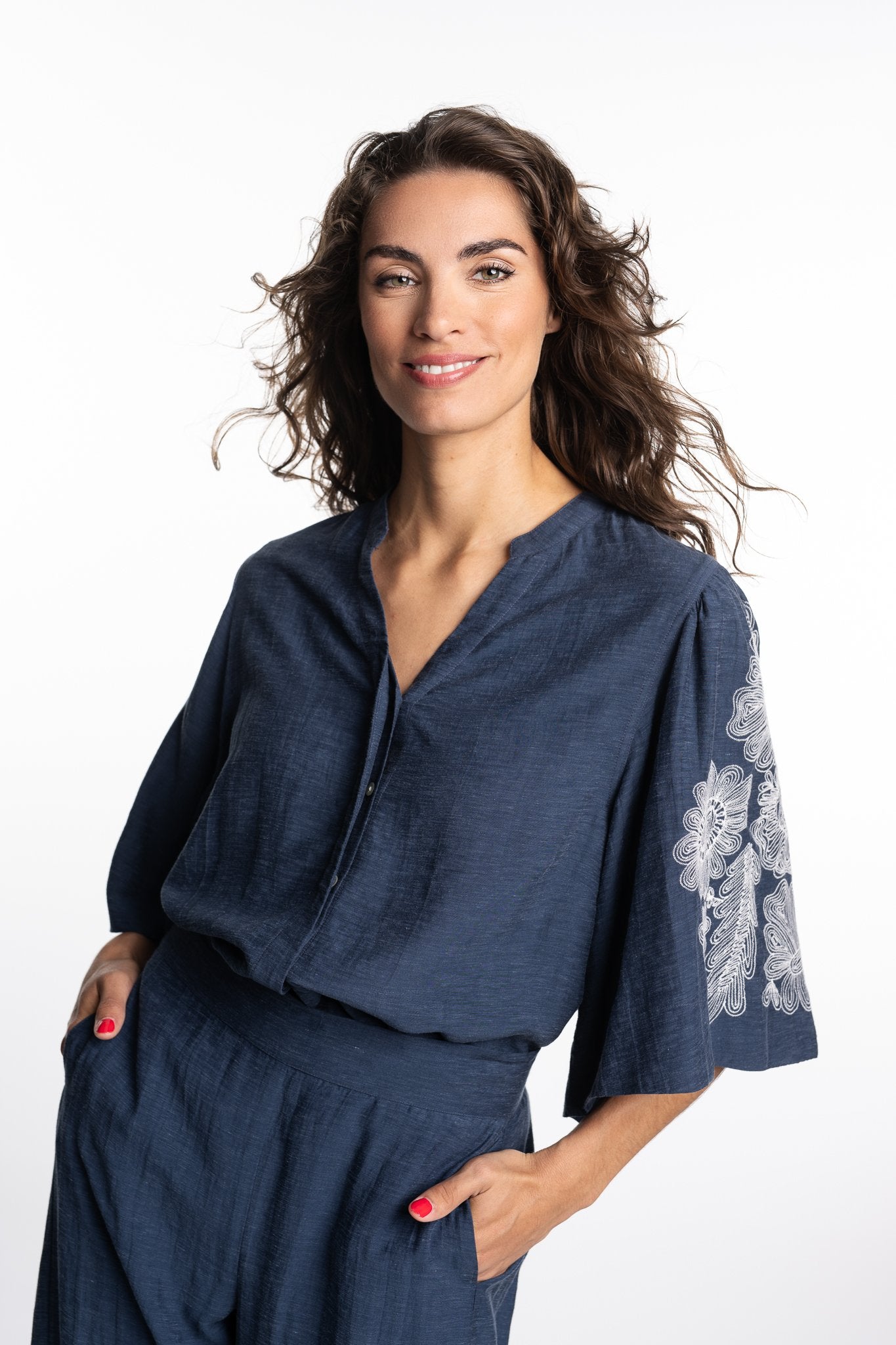 Prachtige bloes in blauwgrijs met witte borduursel op mouw. Een hele mooie kwaliteit in viscose en ecovero! Bijpassende broek ivana is in dezelfde stof met elastiek in rug