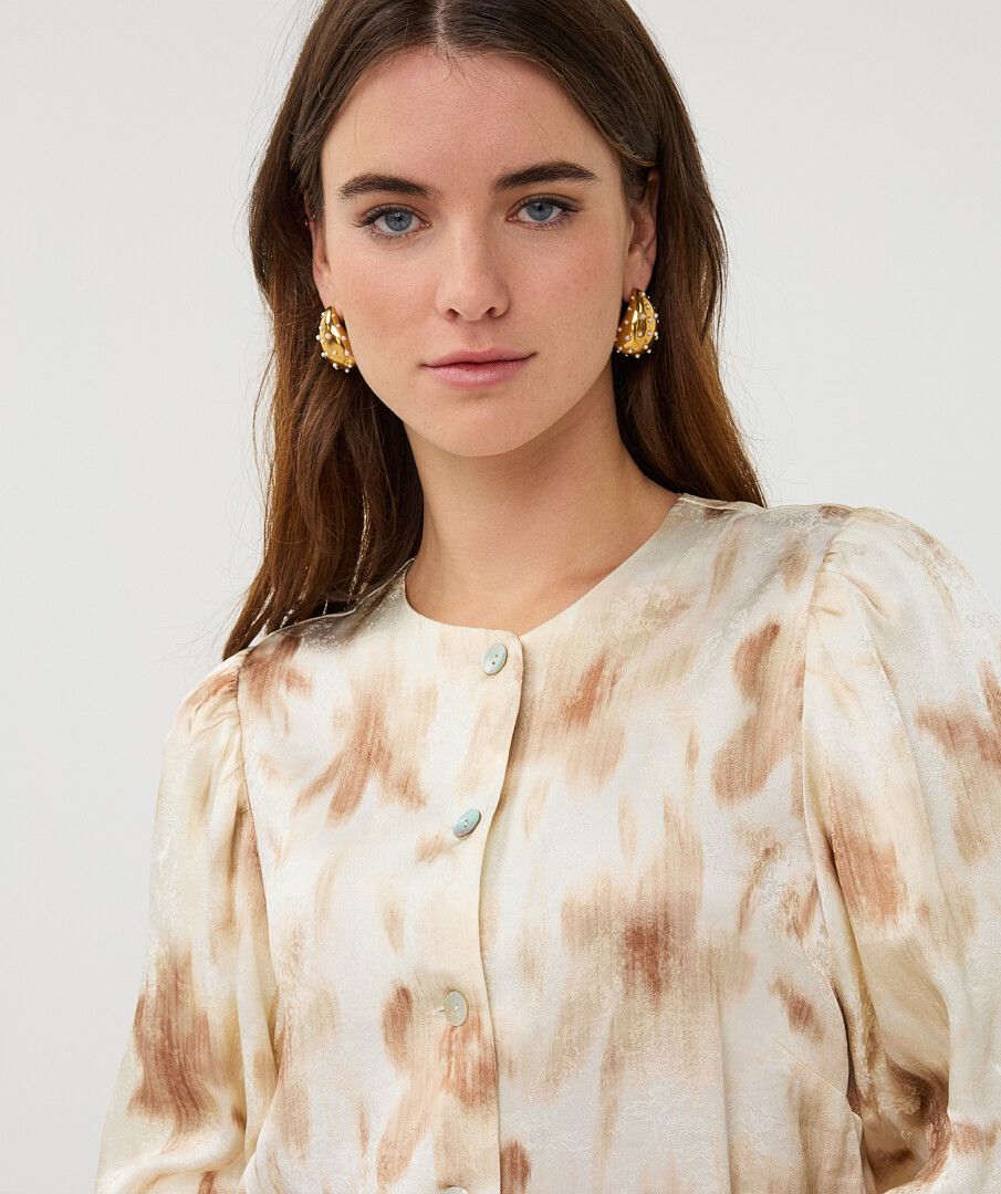 Cropped blouse met ballonmouwen en parelmoer knopen. De blouse is gemaakt van 100% viscose wat zorgt voor een lichte glans.