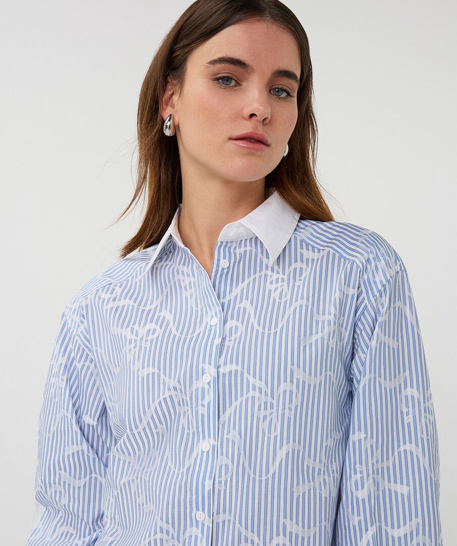 Bloes in katoen met lichtblauwe streepjes en strikjes print.
