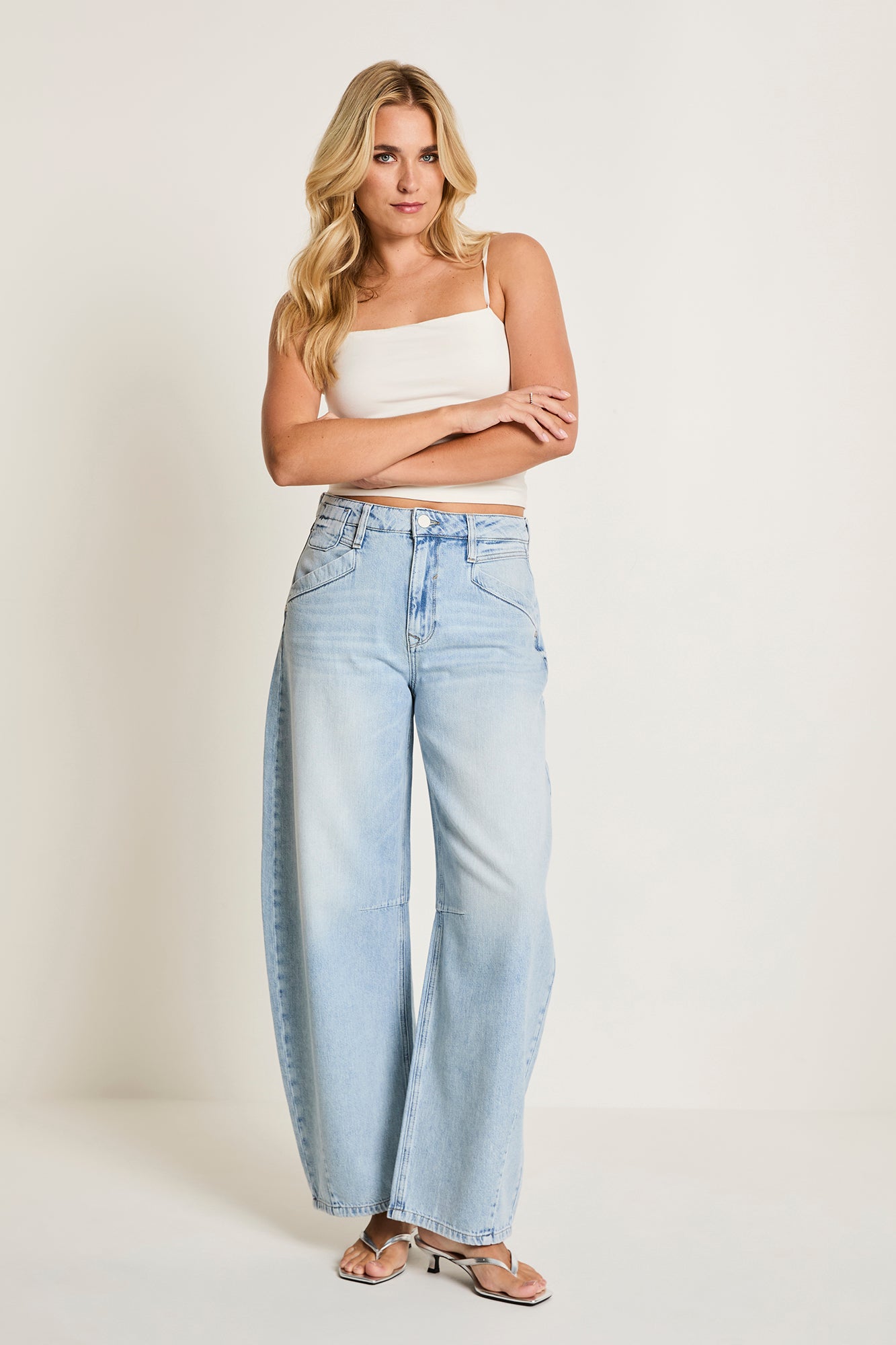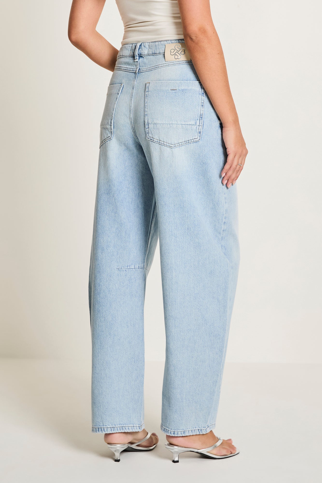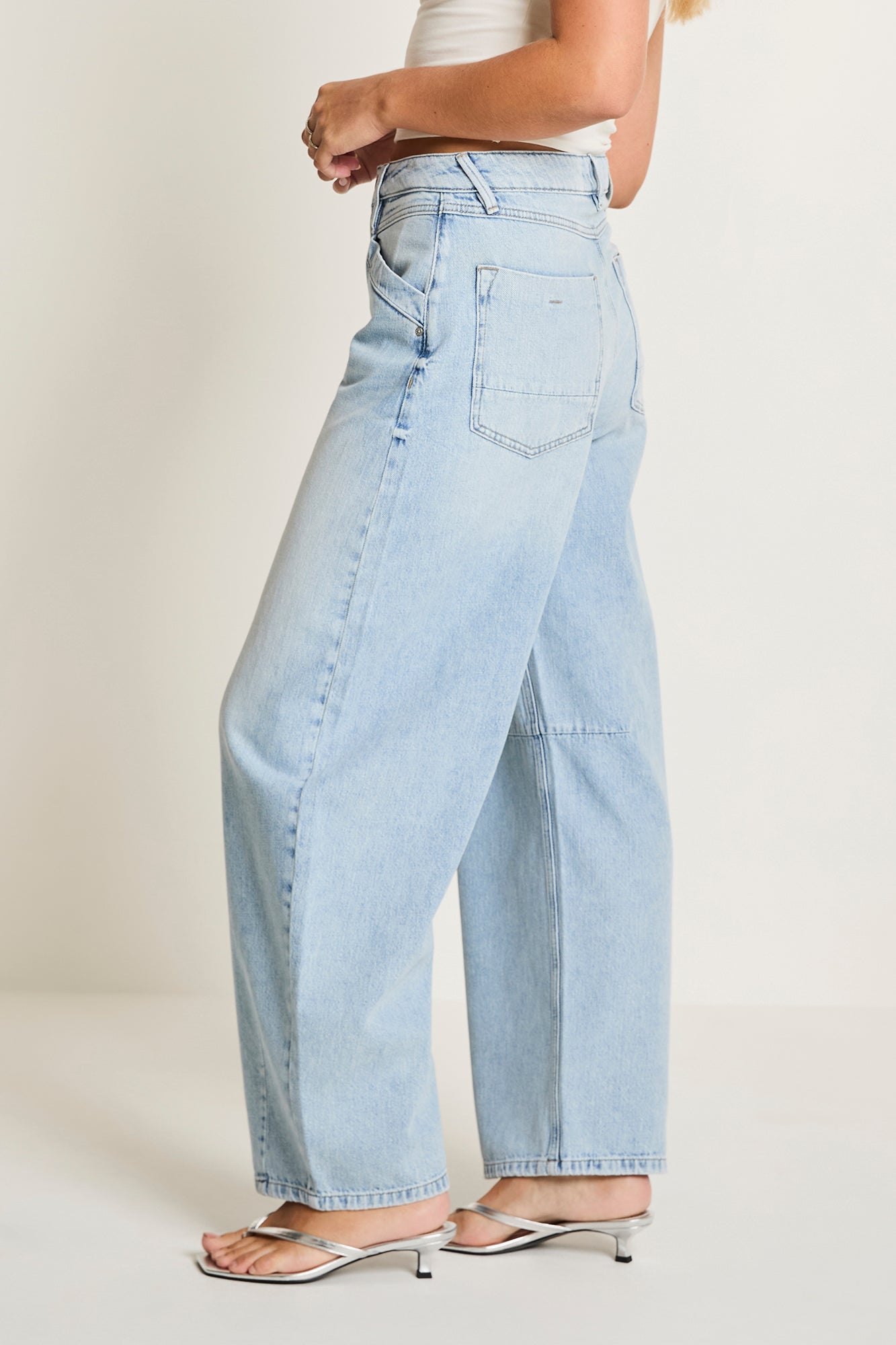 De Becca Barrel heeft een hoge taille en wijde pijpen over het gehele been en loopt boven de enkels smaller toe.