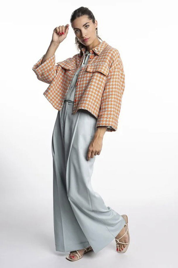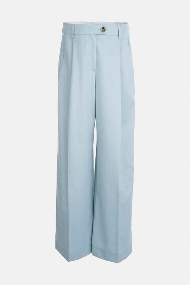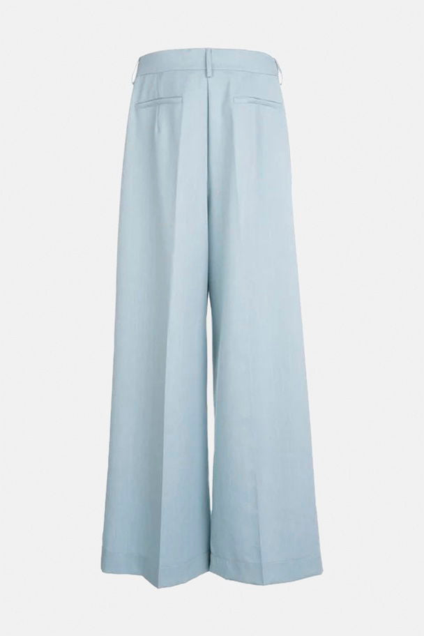 Broek in hele mooie kwaliteit in lichtblauw met fijn wit lijntje. Wijde benen en smaller in de taille. Rits en zijknoop.