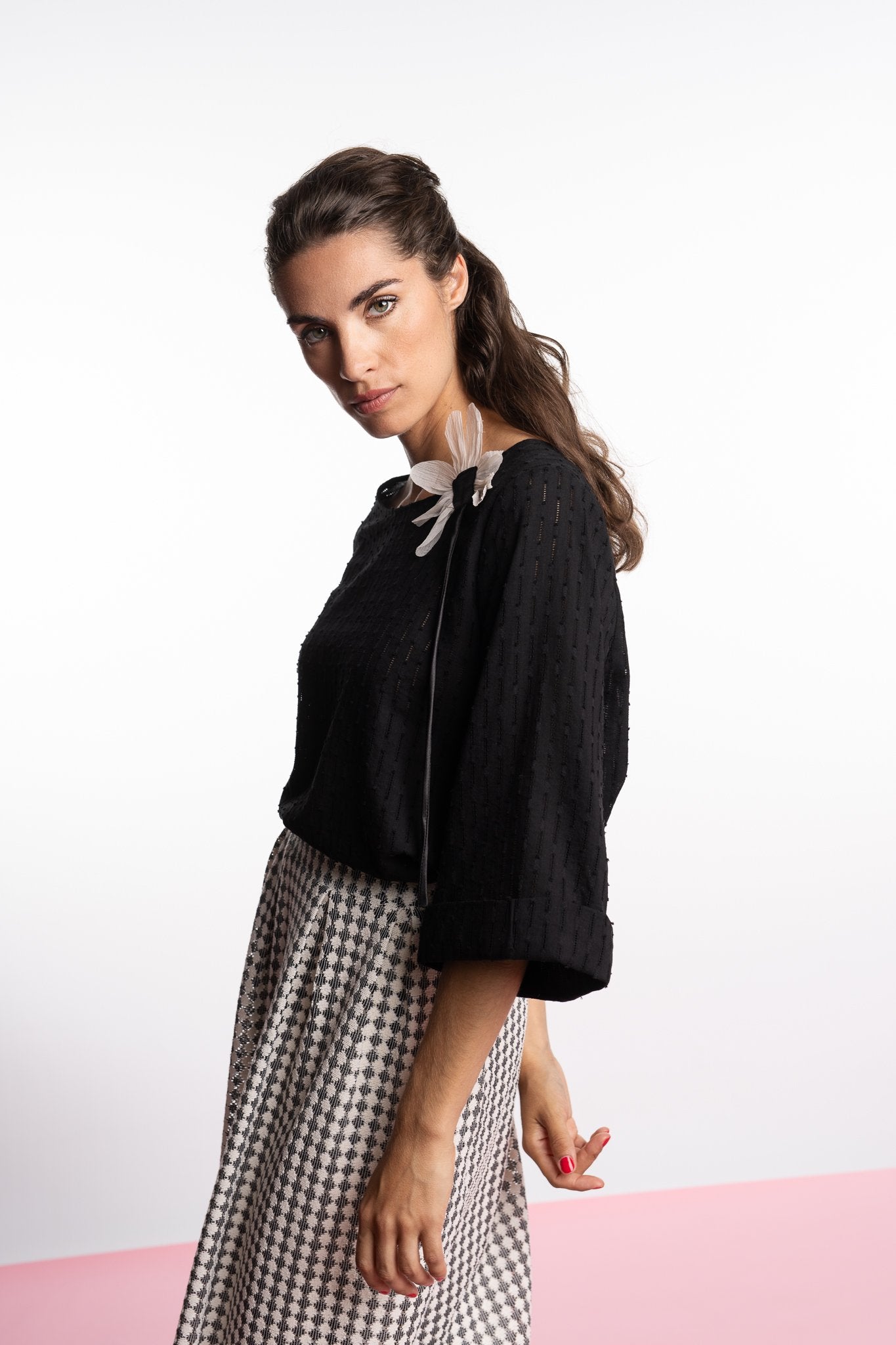 Soepelvallend gehaakte lange rok met zijrits in ecru en zwart. Geen plooien op buik!