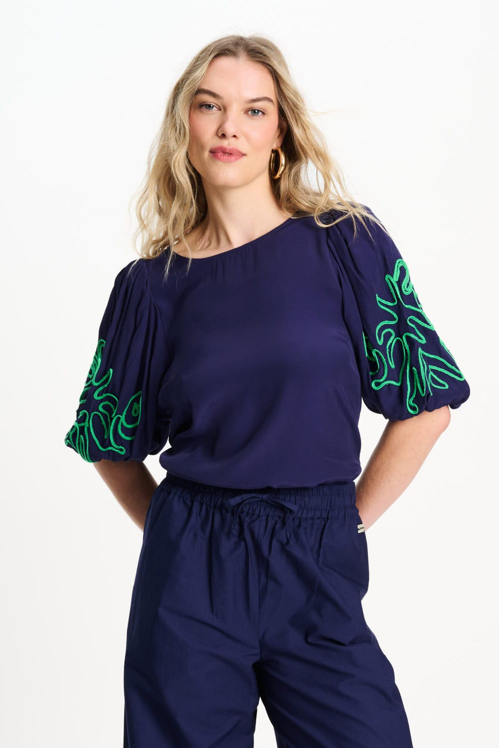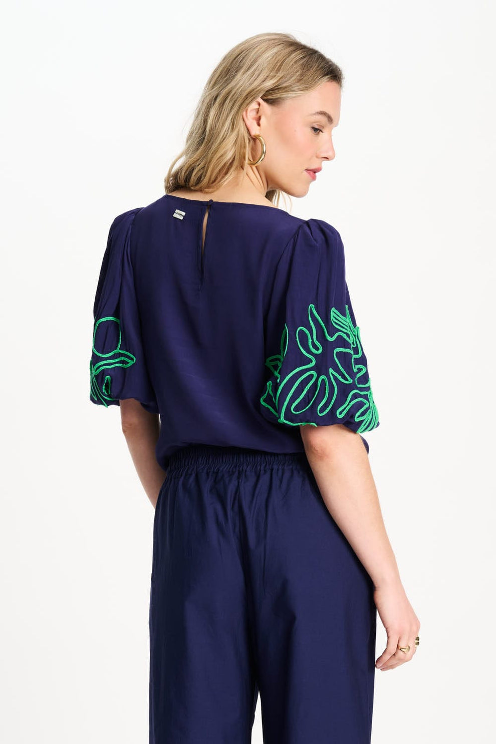 Deze donkerblauwe top heeft opvallende groene details op de mouwen. De korte pofmouwen met elastiek geven de top een speels effect, terwijl de ronde hals en kleine knoopsluiting achter zorgen voor een nette afwerking.