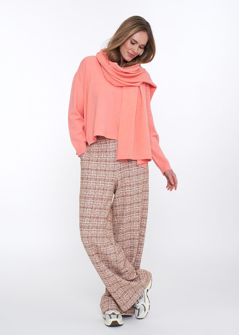 Deze sjaal is een tijdloos accessoire dat stijl en comfort combineert. Gemaakt van een viscoseblend met een zachte, luxueuze touch, voelt hij aangenaam aan op de huid en biedt hij lichte warmte. De ribgebreide uiteinden geven het ontwerp een klassieke afwerking, terwijl de soepele structuur het dragen extra comfortabel maakt. Ideaal voor dagelijks gebruik of als finishing touch bij een gelaagde look.
