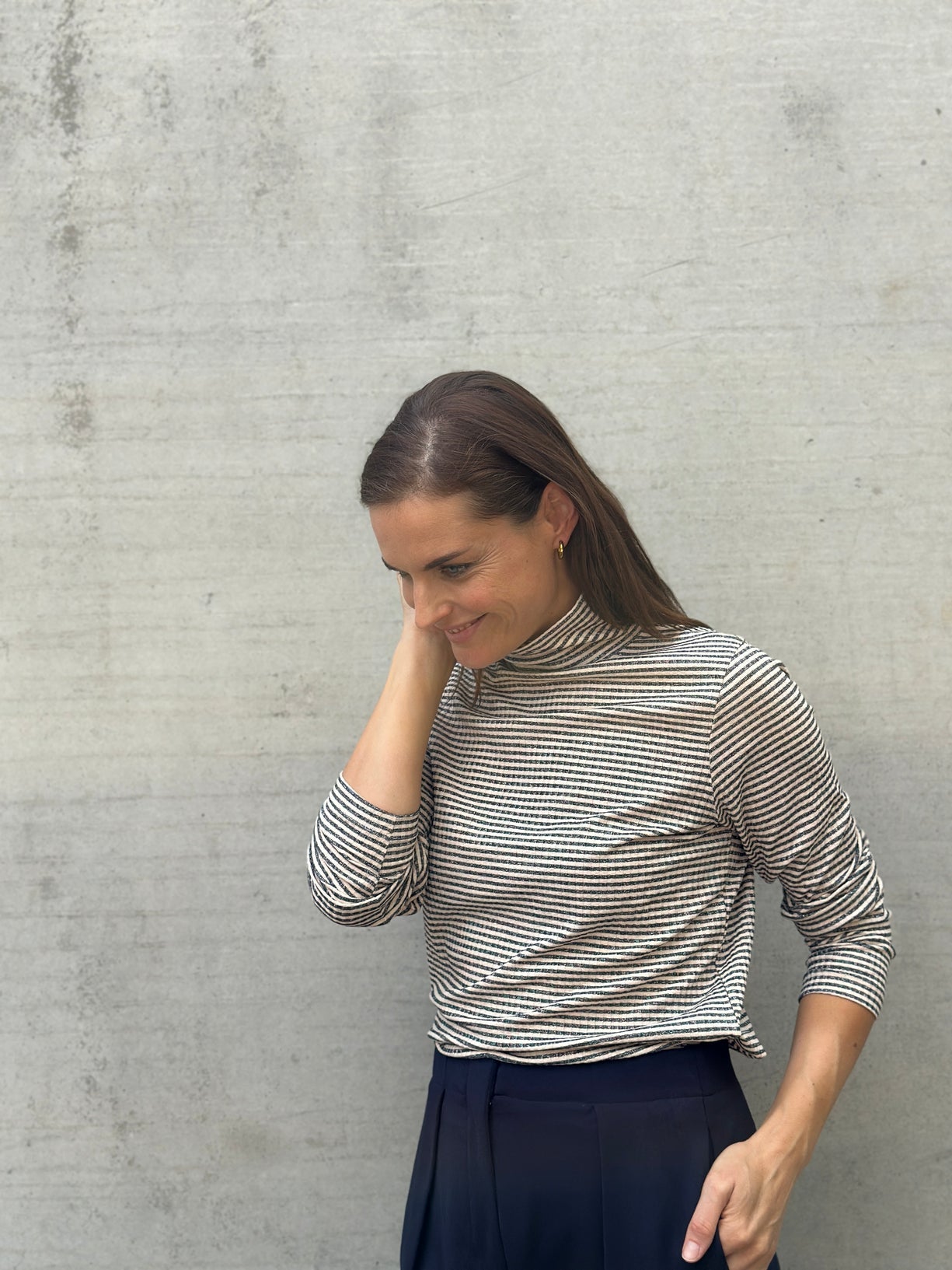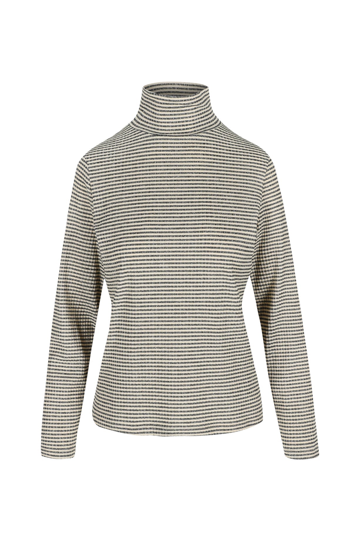 Deze fijne beige souspull met hoge kraag en donkergrijze streepjes is een subtiele blikvanger. De glitterdraad geeft net dat beetje extra sparkle. Ideaal om onder een jurk, blazer of knit te dragen, maar ook super mooi als top om zo te stylen.