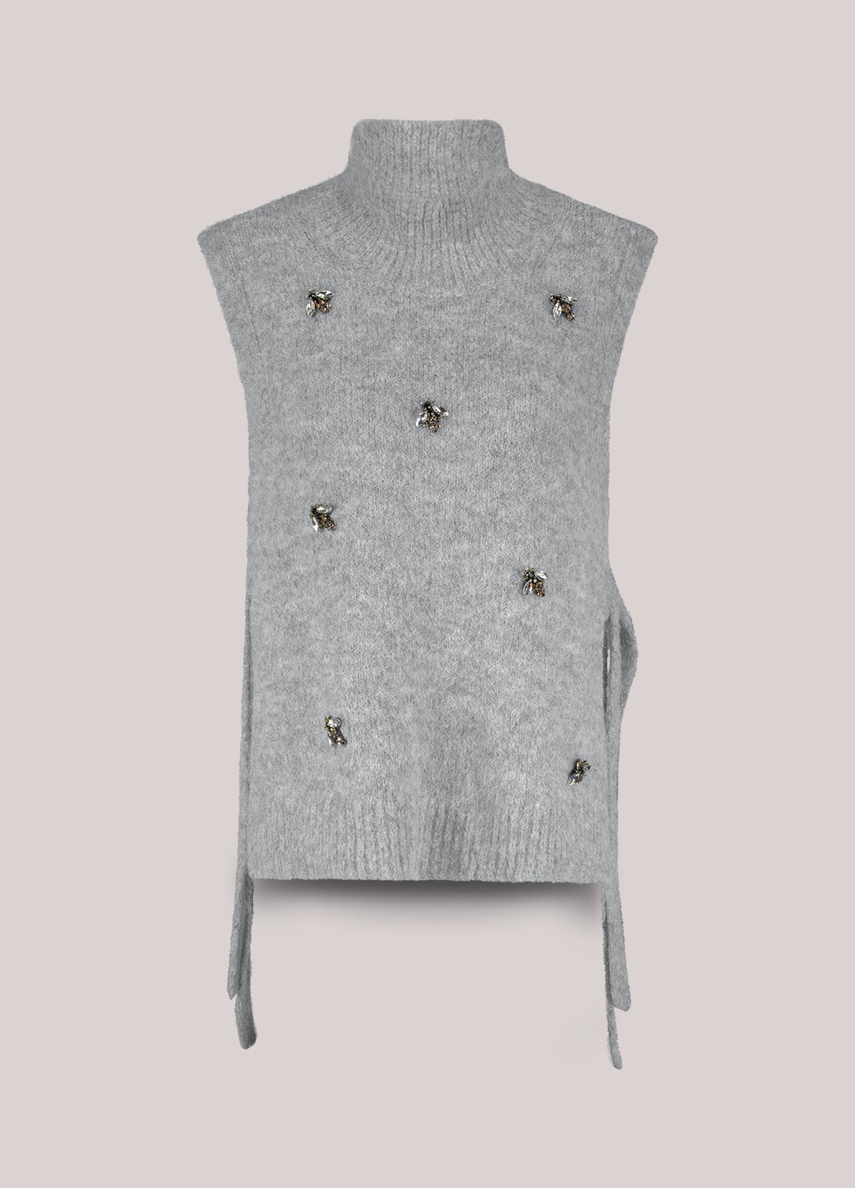 Deze mouwloze spencer heeft een opstaand boordje en striksluiting aan de zijkanten. Gebreid met zachte garen en versierd met insectvormige broches. Dit model is leuk te combineren met een blouse of over de fitted longsleeve 3s5170.