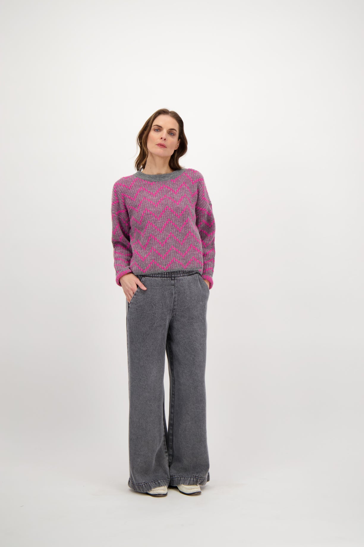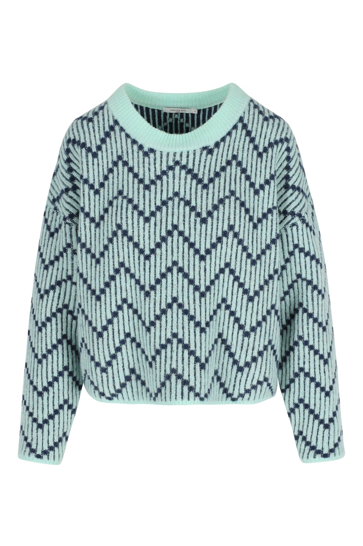 Zin in zachtheid met een twist? Deze trui combineert een opvallend zigzagmotief met een frisse mintgroene tint. De losvallende pasvorm en geribde boorden zorgen voor een relaxte, cozy look — perfect om stijlvol warm te blijven op frisse winterdagen. Combineer met een jeans voor casual chic of draag 'm met een rok voor een speelse, eigentijdse look.
