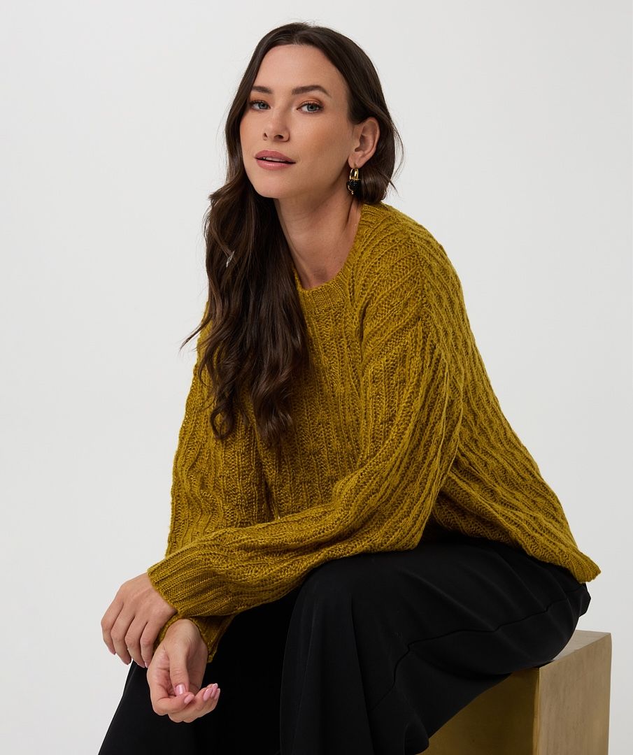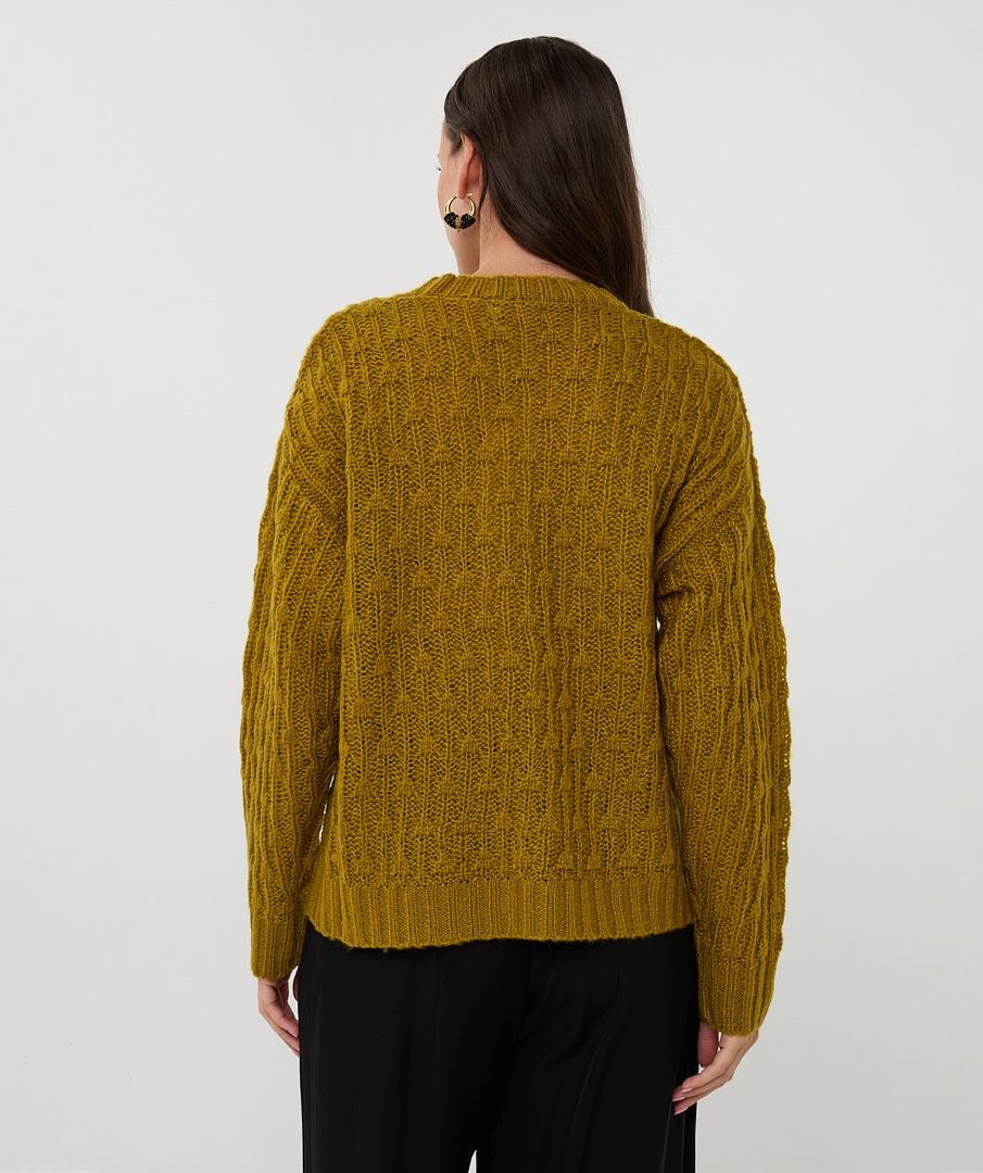 Zachte trui in een ajour knit. Til je look naar een hoger niveau door hem te dragen over een witte blouse op een nette broek. Model is 1.73m en draagt maat S.