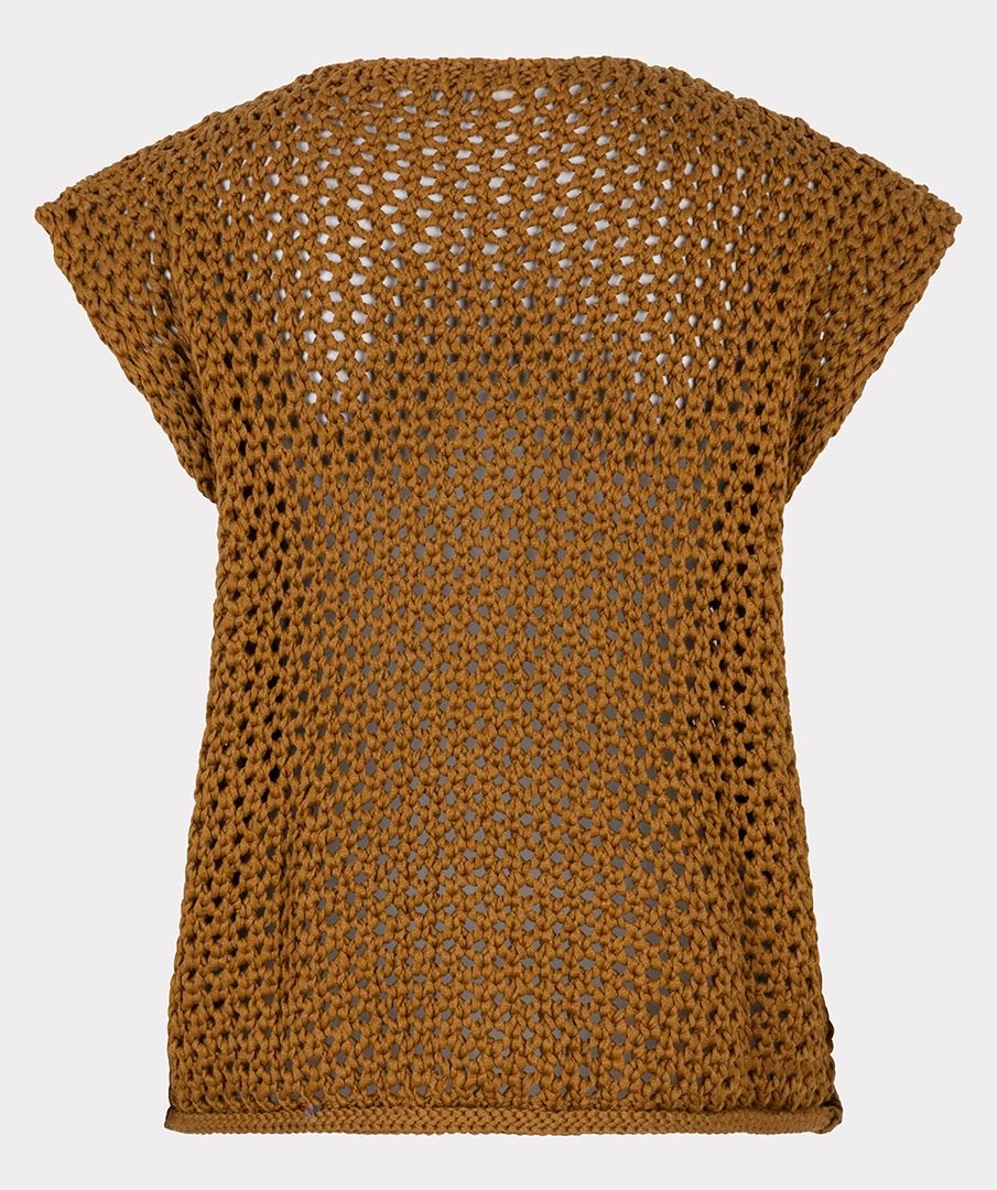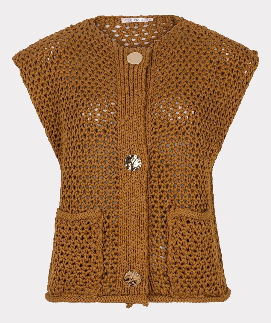 Open gebreid giletvestje met kapmouwen, chique gouden knopen en steekzakjes. Model is 1.73m en draagt maat S. S= 36/38 L=40/42