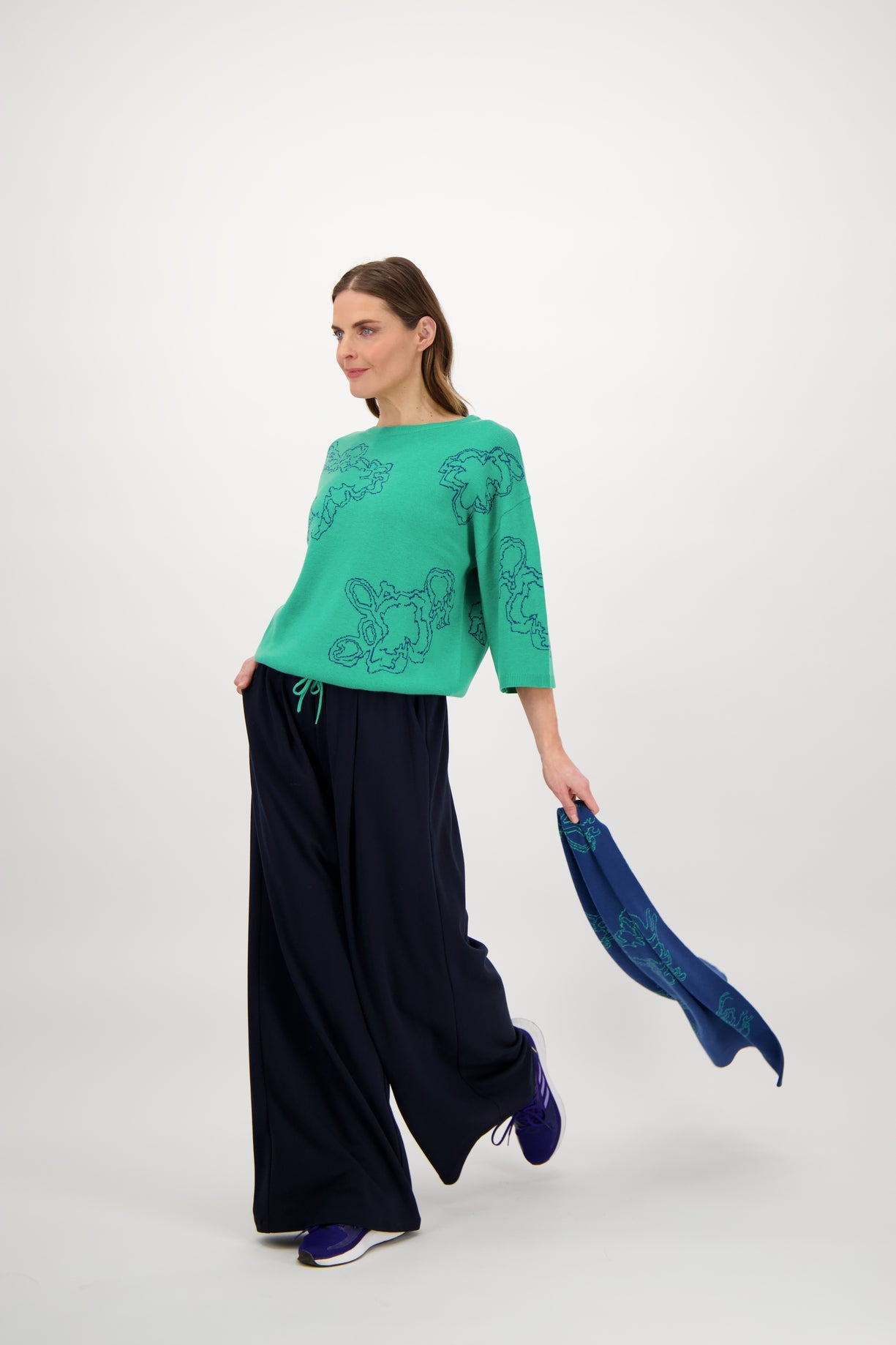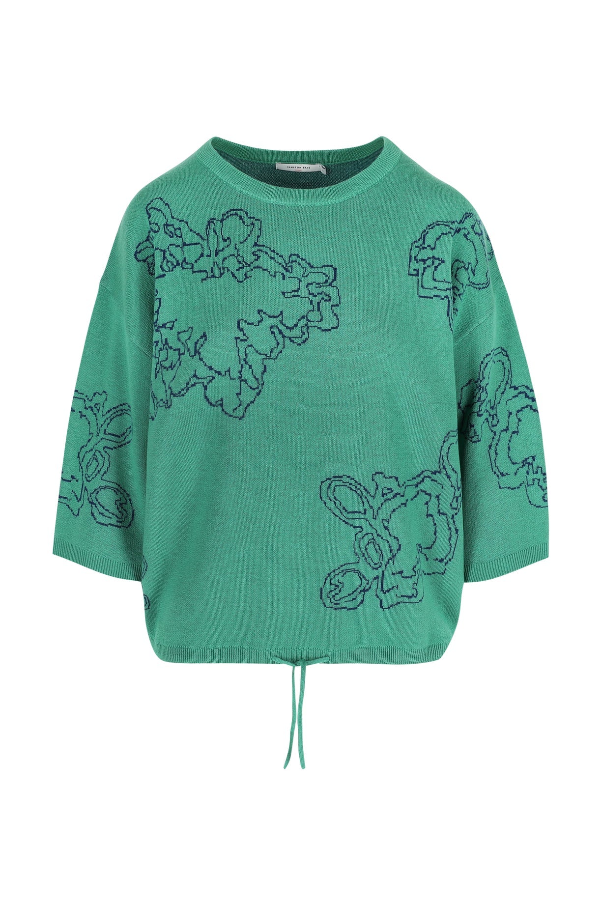 Licht, stijlvol en met een arty twist: dit fijne truitje in mintgroen is versierd met een subtiel ingebreid motief in blauw, geïnspireerd op organische vormen. De driekwartmouwen geven het geheel een luchtige, vrouwelijke look. Perfect voor dagen waarop je iets bijzonders wil dragen, effortless.